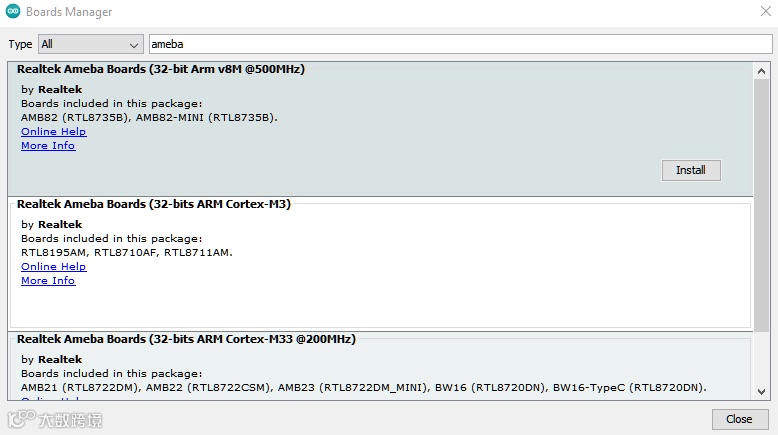 安装工具运行成功后,可以打开 Arduino IDE,然后进入 "工具"->"开发板"->"开发板管理器...". 尝试在列表中找到 "Realtek Ameba Boards",点击 "Install(安装)",然后 Arduino IDE 开始下载所需文件。