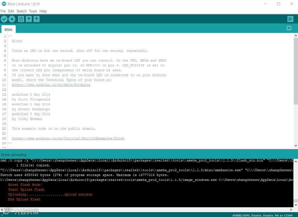 Arduino IDE 会在 IDE 窗口底部打印编译信息。编译完成后将收到如下信息。