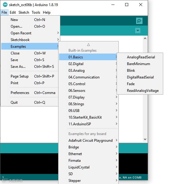 打开 "文件" -> "示例" -> "01.Basics" -> "Blink":