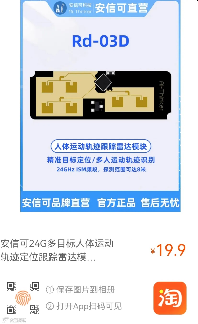 Rd-03尺寸为20.0*20.0mm,体积小,即插即用,实时上报探测结果,更利于用于小型化智能单品中。