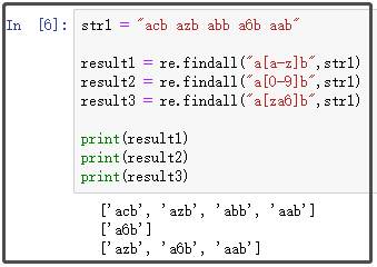 代码解释:不管是①②③,表示匹配开头是a,末尾是b。唯一不同的就是[ ]符号中匹配值不同。