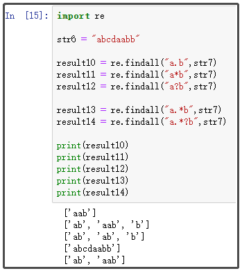 代码解释:点号一般与*号和?号搭配使用。仔细观察①-⑤处的正则表达式,开头和结尾都是a、b,唯一不同的就是它们之间的符号。