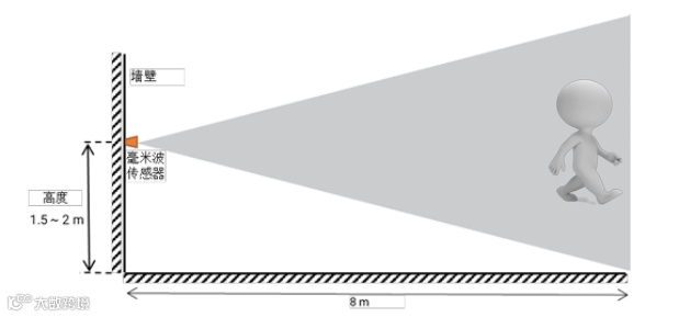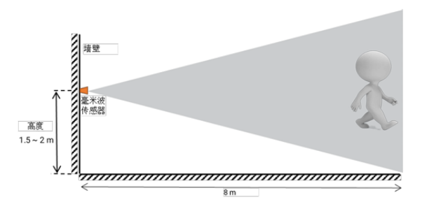挂壁安装高度为1.5m,此时Rd-03L在默认配置下最大运动感应范围为法向8 m、水平和俯仰方向夹角±60°的圆锥形空间。
