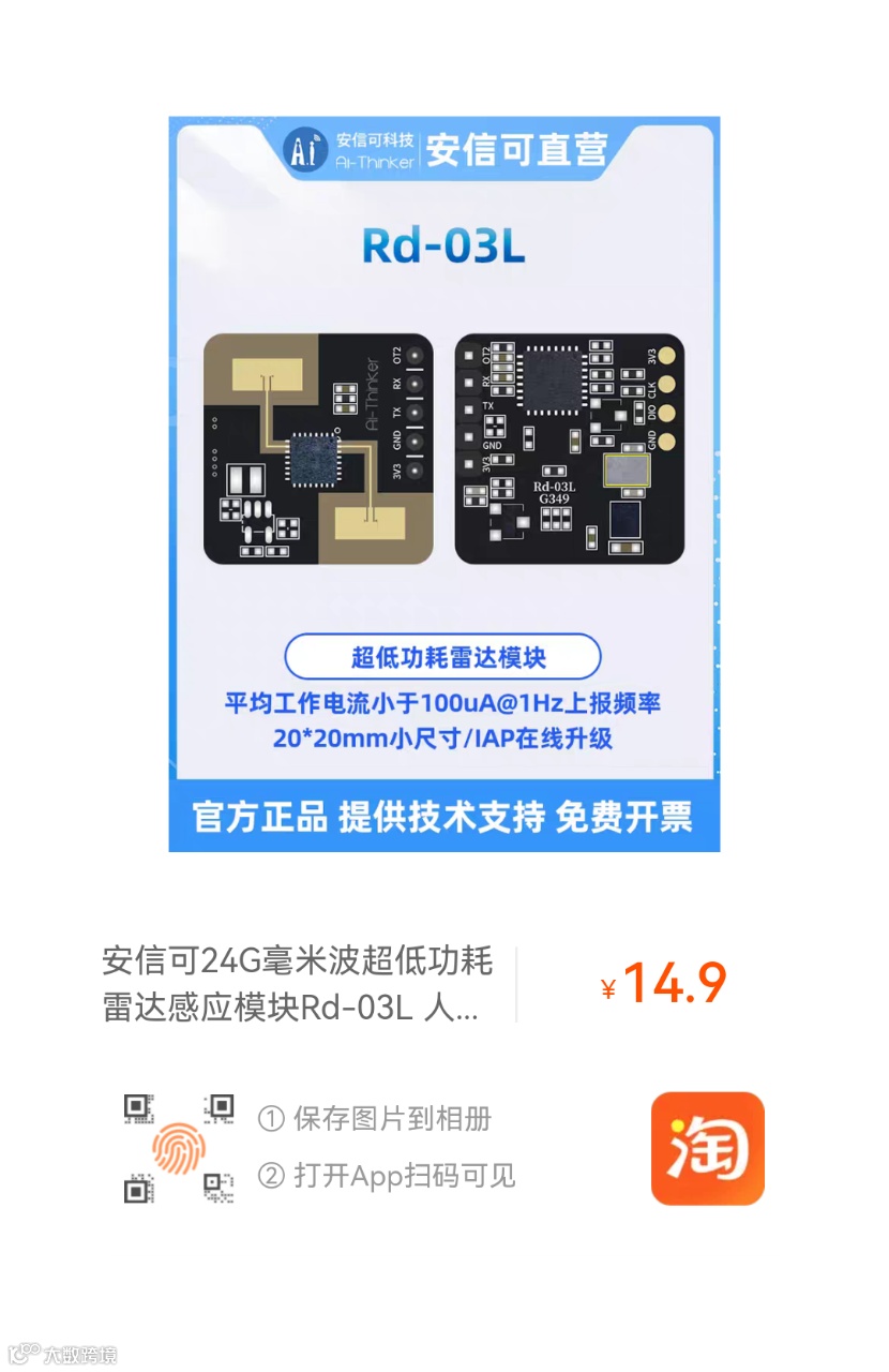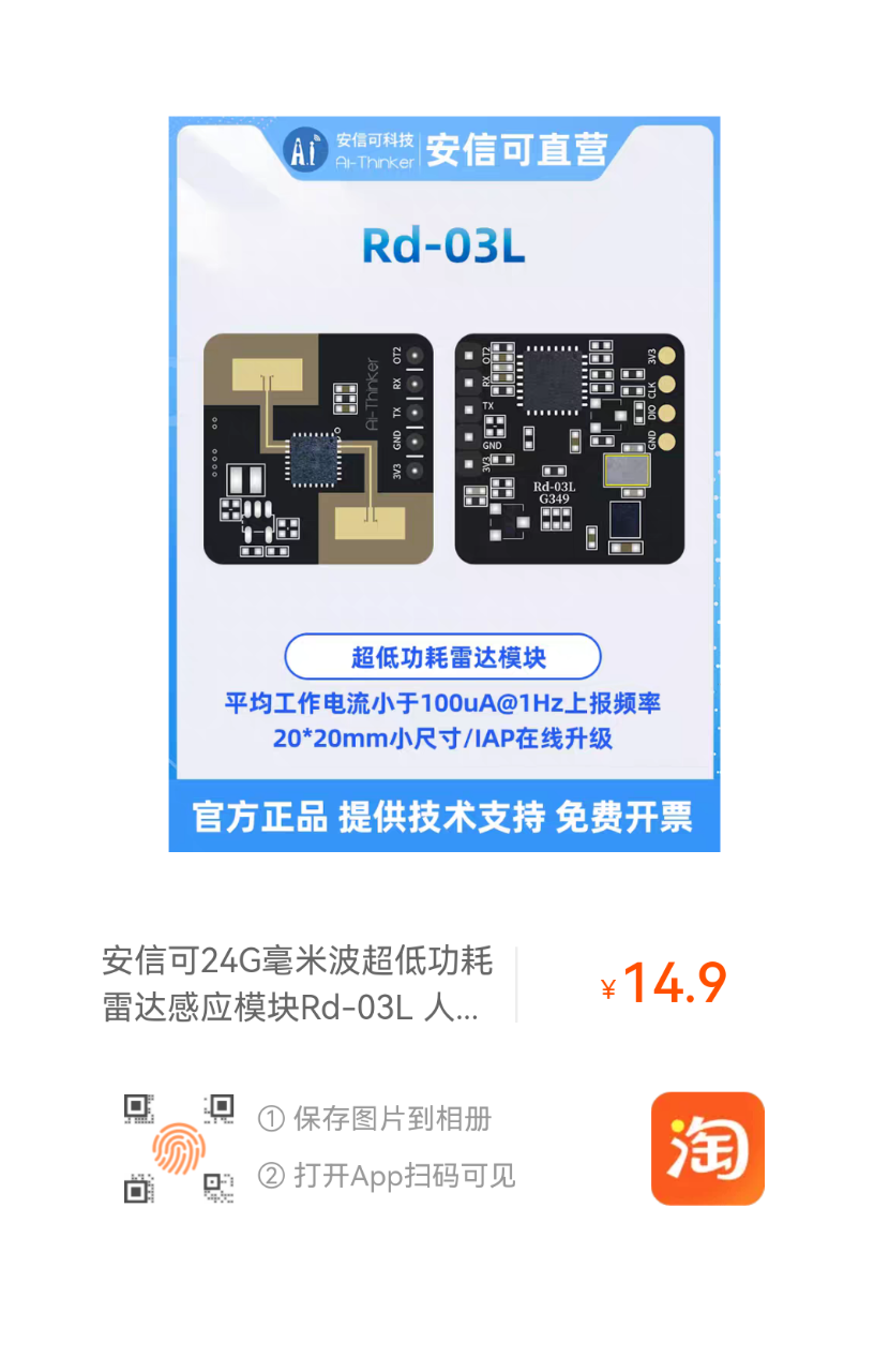 安信可Rd-03L雷达模组尺寸20*20mm,节省产品占用空间,可以快速嵌入到产品主板中。