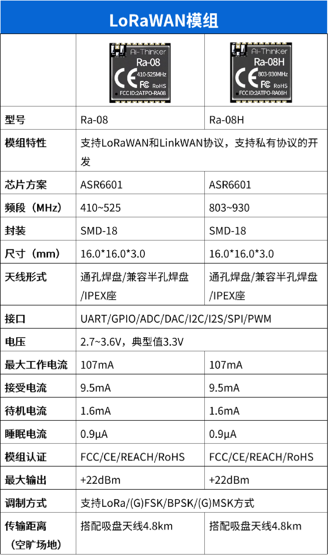 Ra-08、Ra-08H模组支持LoRa/(G)FSK/BPSK/(G)MSK调制方式。