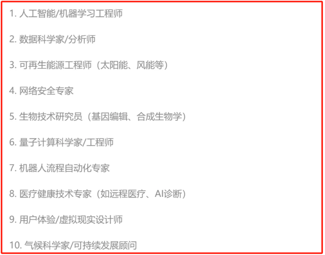 量子计算虽然现在处于早期阶段,但未来十年可能会有突破,相关的研究和工程岗位需求增加,高技能意味着高工资。机器人工程师和自动化专家也是,制造业和服务业自动化趋势明显,尤其是协作机器人和服务机器人。