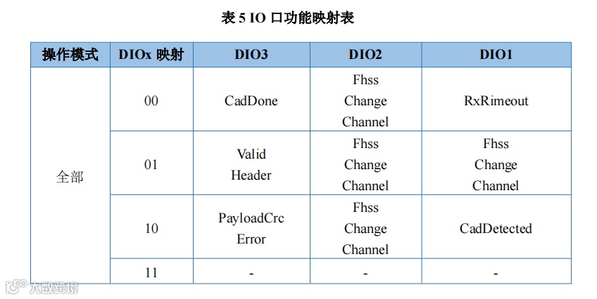 SX1262/LLCC68 的通用 IO 引脚在 LoRa™模式下均可用。它们的映射关系取决于 RegDioMapping1和 RegDioMapping2 这两个寄存器的配置。