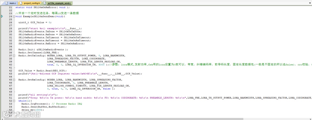 true, 0, 0, LORA_IQ_INVERSION_ON, 3000 );用来设置Ra-01S/SC-P模组的参数;参数:lora模式,发射功率,fsk用的lora设置为0就可以,带宽,纠错编码率,前导码长度,固定长度数据包(一般是不固定的所以选false),crc校验,0表示关闭跳频,跳频之间的符号数(关闭跳频这个参数没有意义);此函数实现如下图所示: