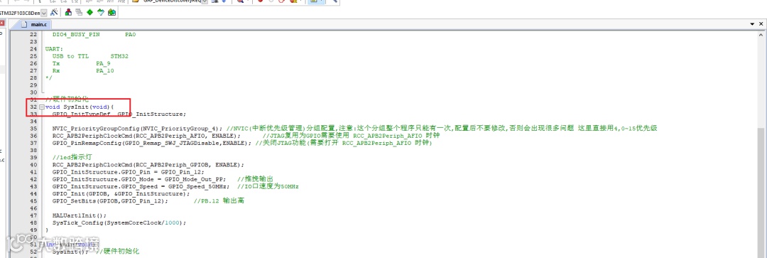 NVIC_PriorityGroupConfig()函数将中断优先级分组配置为4,4位全部分配为抢占式优先级;PB12引脚设置为控灯引脚,用来指示程序发送或收到数据;将时钟配置为1ms执行一次中断函数,中断函数内容如下图: