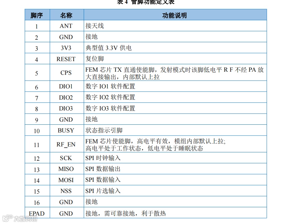 提示:若需要更大发射功率,需要使用5V给PA供电,可给予VCCPA引脚5V电压;(模组默认使用内部3.3V给PA供电)
