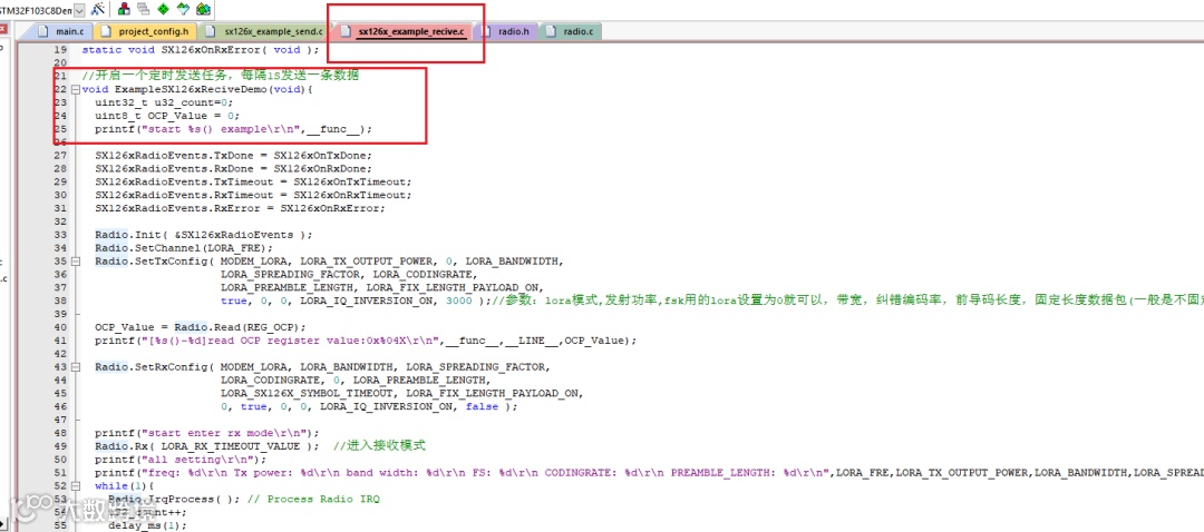 与发送demo函数重复部分不再介绍;Radio.Rx( LORA_RX_TIMEOUT_VALUE );使模组进入接受模式;函数实现如下: