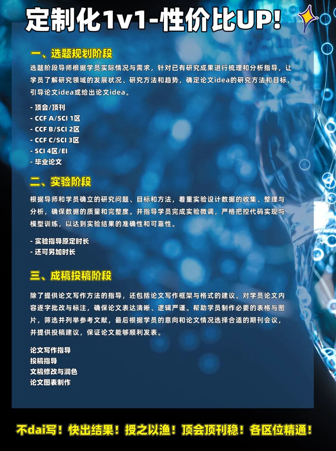 如何快速找到idea,如何正确的选择模型,怎么避免与其他工作重复, 什么样的实验计划省时效果显著,一边实验一边出论文初稿技能,针对不同的期刊会议绘图方法,终稿完善,投稿策略,期刊/会议选择,response,直到accpet!研梦非凡全程陪伴你产出科研成果!