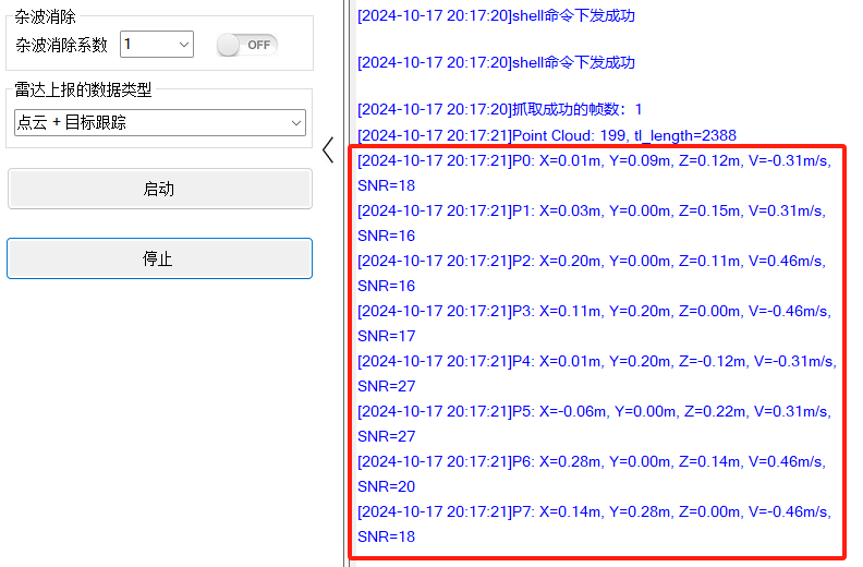 配置完雷达之后会有计算结果,自动适配了最后帧数据的结构,确认了雷达上报的数据,选择雷达上报数据的类型为点云 + 目标跟踪,看一下串口输出的信息。