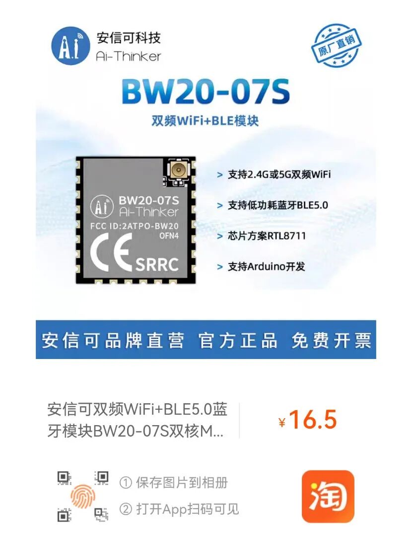 BW20系列模组是安信可科技基于RTL8711 系列芯片开发的双频Wi-Fi +BLESoC 模组,支持双频(2.4 GHz 或 5.8 GHz)802.11a/b/g/n WLAN 协议和Bluetooth 5.0协议。