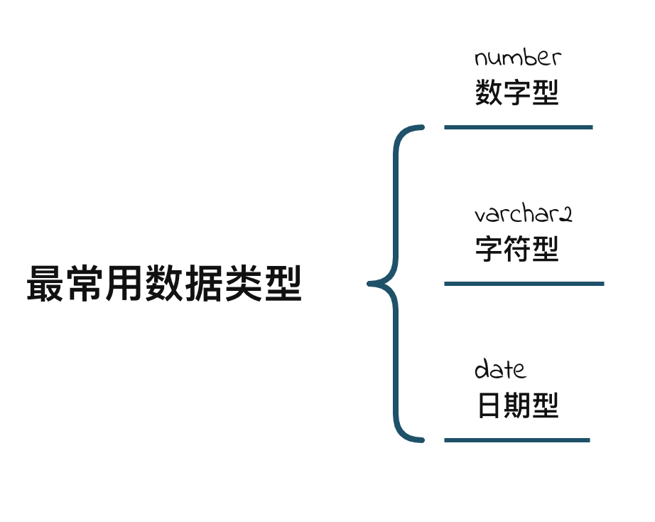 不要着急,先来介绍一下数据库中最常用的3个数据类型:NUMBER,VARCHAR2,DATE,分别为数字型,字符型,日期型。顾名思义,即用来定义表中列字段用来存放数据的类型。