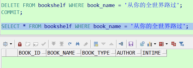 INSERT INTO bookshelf (book_id,book_name,book_type,author,intime) VALUES (3,'从你的全世界路过','短篇小说','张嘉佳',SYSDATE);