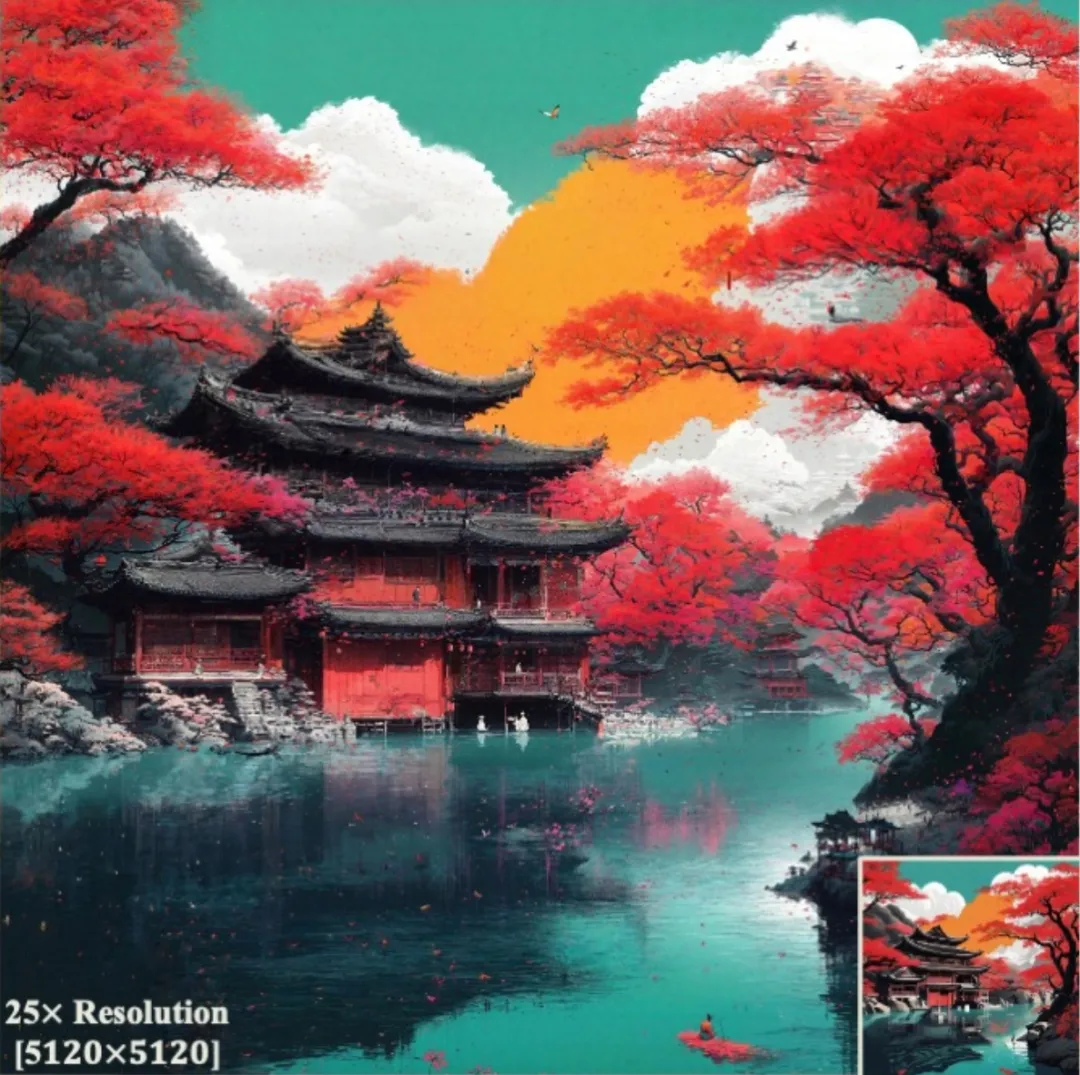 右下角是输入的图片,分辨率提升 25 倍,变为 5120 * 5120 分辨率的高清图。