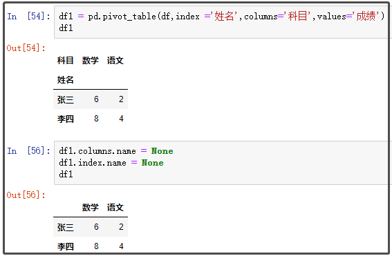 df1 = pd.pivot_table(df,index ='姓名',columns='科目',values='成绩')