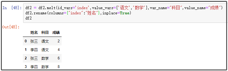 df2 = df2.melt(id_vars='index',value_vars=['语文','数学'],var_name="科目",value_name="成绩")