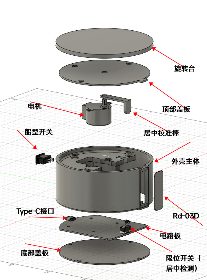 本项目由以下部分组成,底部盖子、主体(含电路板)、顶部盖子、旋转台。