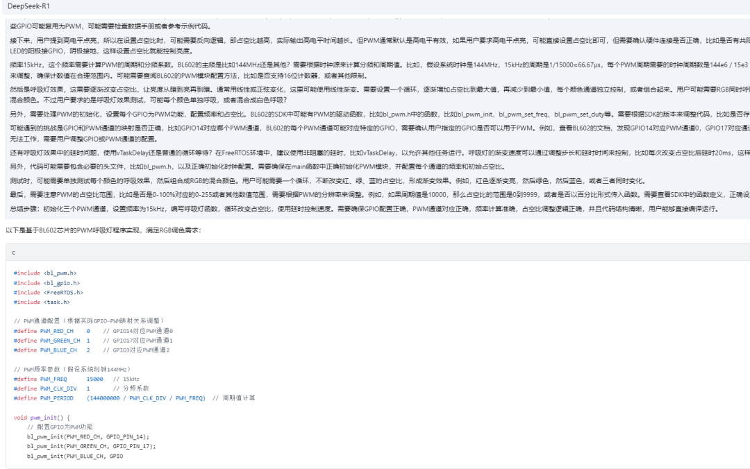 // PWM通道配置(根据实际GPIO-PWM映射关系调整)// PWM频率参数(假设系统时钟144MHz)void pwm_init() {// 配置GPIO为PWM功能bl_pwm_init(PWM_RED_CH, GPIO_PIN_14);bl_pwm_init(PWM_GREEN_CH, GPIO_PIN_17);bl_pwm_init(PWM_BLUE_CH, GPIO_PIN_3);// 统一设置PWM参数for(int ch = 0; ch < 3; ch++) {bl_pwm_set_freq(ch, PWM_FREQ);bl_pwm_set_duty(ch, 0); // 初始占空比0%}bl_pwm_start();}void breathing_effect(uint8_t ch, uint32_t duration_ms) {const uint32_t steps = 100;const uint32_t delay = duration_ms / (steps * 2);// 渐亮for(int i = 0; i <= steps; i++) {bl_pwm_set_duty(ch, (PWM_PERIOD * i) / steps);vTaskDelay(delay / portTICK_PERIOD_MS);}// 渐暗for(int i = steps; i >= 0; i--) {bl_pwm_set_duty(ch, (PWM_PERIOD * i) / steps);vTaskDelay(delay / portTICK_PERIOD_MS);}}void rgb_test_task(void *pvParameters) {while(1) {// 红色呼吸breathing_effect(PWM_RED_CH, 2000);// 绿色呼吸breathing_effect(PWM_GREEN_CH, 2000);// 蓝色呼吸breathing_effect(PWM_BLUE_CH, 2000);// 白色混合呼吸for(int i = 0; i <= 100; i++) {bl_pwm_set_duty(PWM_RED_CH, (PWM_PERIOD * i) / 100);bl_pwm_set_duty(PWM_GREEN_CH, (PWM_PERIOD * i) / 100);bl_pwm_set_duty(PWM_BLUE_CH, (PWM_PERIOD * i) / 100);vTaskDelay(20 / portTICK_PERIOD_MS);}for(int i = 100; i >= 0; i--) {bl_pwm_set_duty(PWM_RED_CH, (PWM_PERIOD * i) / 100);bl_pwm_set_duty(PWM_GREEN_CH, (PWM_PERIOD * i) / 100);bl_pwm_set_duty(PWM_BLUE_CH, (PWM_PERIOD * i) / 100);vTaskDelay(20 / portTICK_PERIOD_MS);}}}void main() {pwm_init();xTaskCreate(rgb_test_task, "rgb_test", 512, NULL, 2, NULL);vTaskStartScheduler();}