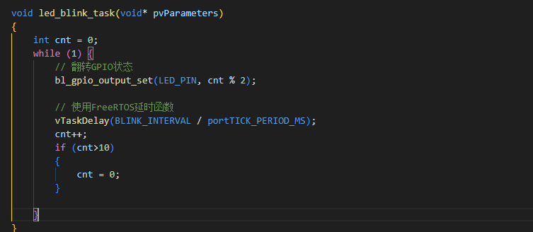 void led_init(void){/* 初始化GPIO时钟 */bl_gpio_enable_output(LED_PIN, 0, 0); // 配置GPIO3为输出模式/* 初始状态设置为低电平(根据电路设计可能需要反转) */bl_gpio_output_set(LED_PIN, 0);}void led_blink_task(void *pvParameters){while (1) {// 翻转GPIO状态bl_gpio_output_set(LED_PIN, !bl_gpio_input_get(LED_PIN));// 使用FreeRTOS延时函数vTaskDelay(BLINK_INTERVAL / portTICK_PERIOD_MS);}}void main(void){// 硬件初始化led_init();// 创建闪烁任务xTaskCreate(led_blink_task, "led_task", 512, NULL, 15, NULL);// 启动任务调度器vTaskStartScheduler();// 程序不会执行到这里while(1) {}}
