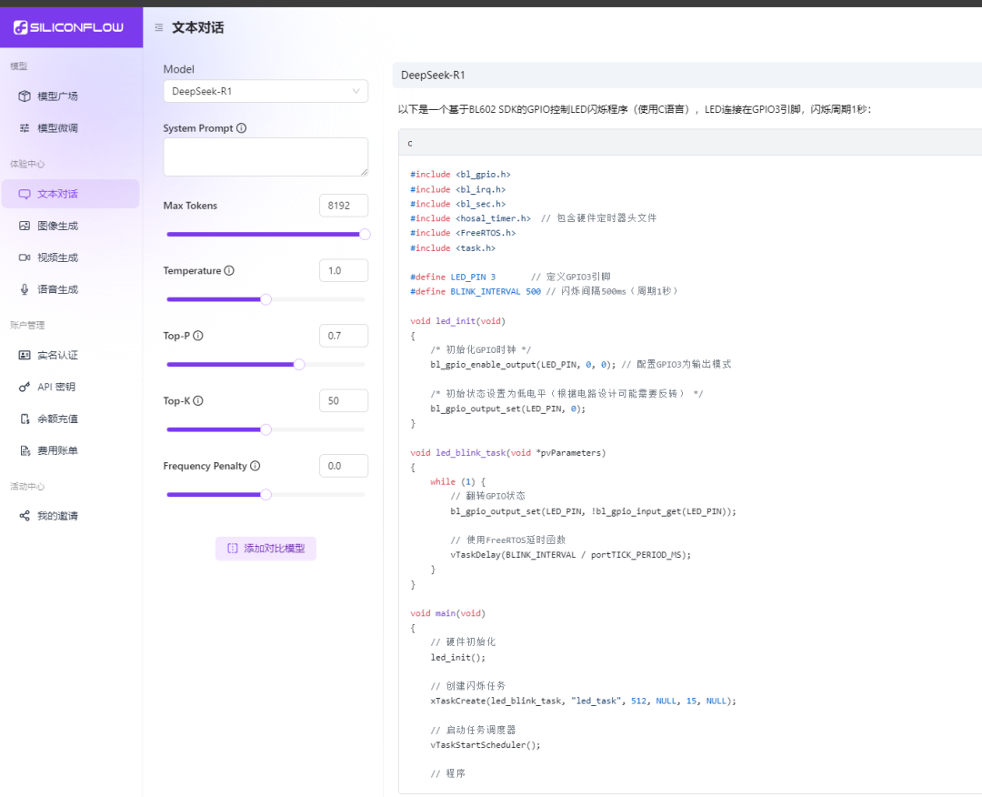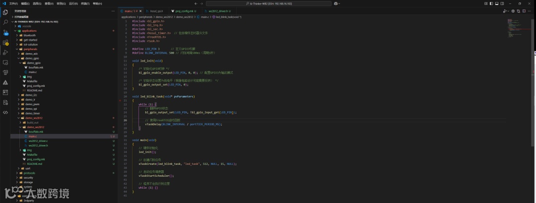 void led_init(void){/* 初始化GPIO时钟 */bl_gpio_enable_output(LED_PIN, 0, 0); // 配置GPIO3为输出模式/* 初始状态设置为低电平(根据电路设计可能需要反转) */bl_gpio_output_set(LED_PIN, 0);}void led_blink_task(void* pvParameters){int cnt = 0;while (1) {// 翻转GPIO状态bl_gpio_output_set(LED_PIN, cnt % 2);// 使用FreeRTOS延时函数vTaskDelay(BLINK_INTERVAL / portTICK_PERIOD_MS);cnt++;if (cnt>10){cnt = 0;}}}void main(void){// 硬件初始化led_init();// 创建闪烁任务xTaskCreate(led_blink_task, "led_task", 512, NULL, 15, NULL);// 启动任务调度器// vTaskStartScheduler();// 程序不会执行到这里while (1) {}}
