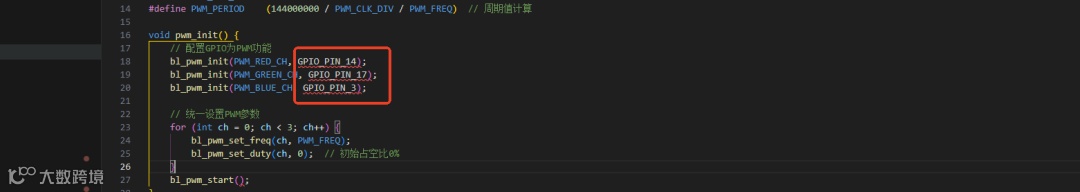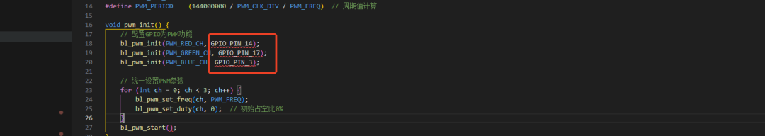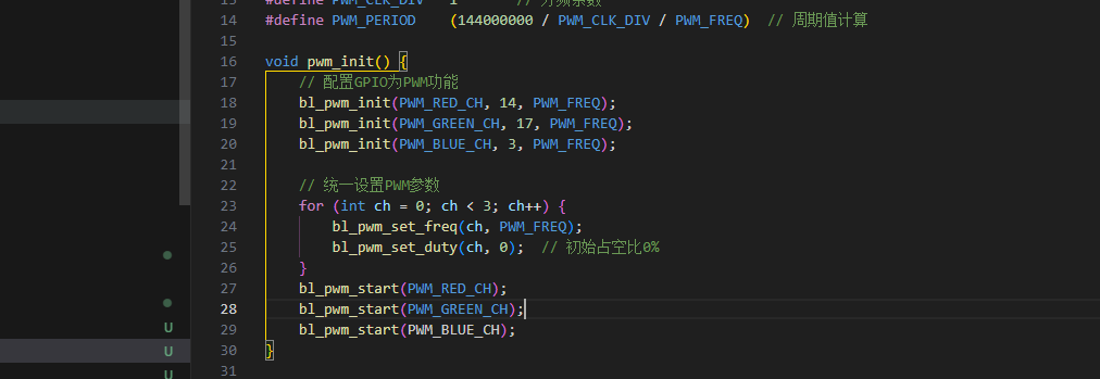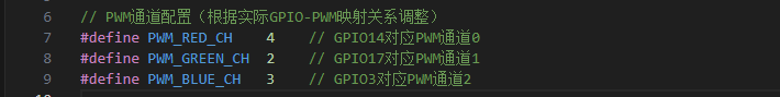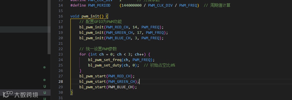 // PWM通道配置(根据实际GPIO-PWM映射关系调整)// PWM频率参数(假设系统时钟144MHz)void pwm_init() {// 配置GPIO为PWM功能bl_pwm_init(PWM_RED_CH, 14, PWM_FREQ);bl_pwm_init(PWM_GREEN_CH, 17, PWM_FREQ);bl_pwm_init(PWM_BLUE_CH, 3, PWM_FREQ);// 统一设置PWM参数for (int ch = 0; ch < 3; ch++) {bl_pwm_set_freq(ch, PWM_FREQ);bl_pwm_set_duty(ch, 0); // 初始占空比0%}bl_pwm_start(PWM_RED_CH);bl_pwm_start(PWM_GREEN_CH);bl_pwm_start(PWM_BLUE_CH);}void breathing_effect(uint8_t ch, uint32_t duration_ms) {const uint32_t steps = 100;const uint32_t delay = duration_ms / (steps * 2);// 渐亮for (int i = 0; i <= steps; i++) {bl_pwm_set_duty(ch, (PWM_PERIOD * i) / steps);vTaskDelay(delay / portTICK_PERIOD_MS);}// 渐暗for (int i = steps; i >= 0; i--) {bl_pwm_set_duty(ch, (PWM_PERIOD * i) / steps);vTaskDelay(delay / portTICK_PERIOD_MS);}}void rgb_test_task(void* pvParameters) {while (1) {// 红色呼吸breathing_effect(PWM_RED_CH, 2000);// 绿色呼吸breathing_effect(PWM_GREEN_CH, 2000);// 蓝色呼吸breathing_effect(PWM_BLUE_CH, 2000);// 白色混合呼吸for (int i = 0; i <= 100; i++) {bl_pwm_set_duty(PWM_RED_CH, (PWM_PERIOD * i) / 100);bl_pwm_set_duty(PWM_GREEN_CH, (PWM_PERIOD * i) / 100);bl_pwm_set_duty(PWM_BLUE_CH, (PWM_PERIOD * i) / 100);vTaskDelay(20 / portTICK_PERIOD_MS);}for (int i = 100; i >= 0; i--) {bl_pwm_set_duty(PWM_RED_CH, (PWM_PERIOD * i) / 100);bl_pwm_set_duty(PWM_GREEN_CH, (PWM_PERIOD * i) / 100);bl_pwm_set_duty(PWM_BLUE_CH, (PWM_PERIOD * i) / 100);vTaskDelay(20 / portTICK_PERIOD_MS);}}}void main() {pwm_init();xTaskCreate(rgb_test_task, "rgb_test", 512, NULL, 2, NULL);// vTaskStartScheduler();}