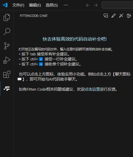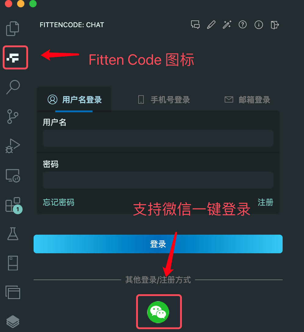 安装好之后,在左侧的导航栏中就可以看到 Fitten Code 的图标,点击即可进行注册和登录,同时支持微信一键登录。