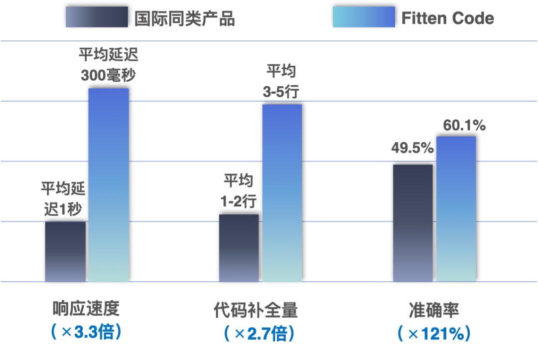 与其他产品每次仅补全 1-2 行代码相比,Fitten Code 平均能补全 3-5 行代码,显著提高了补全的效率。