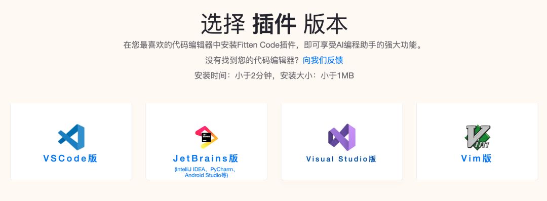 Fitten Code 支持包括 VSCode、Visual Studio、JetBrains 系列的 IDE(如IntelliJ IDEA、PyCharm等),并且也适配了经典的文本编辑器 VIM。