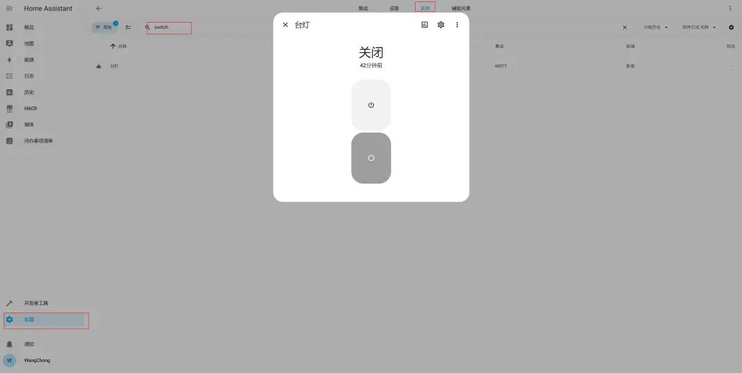 那么这个实体在哪里呢?在HA的Web页面,点击配置, 设备与服务,选择实体,搜索 switch 你便可以看到这个实体。