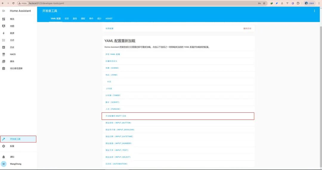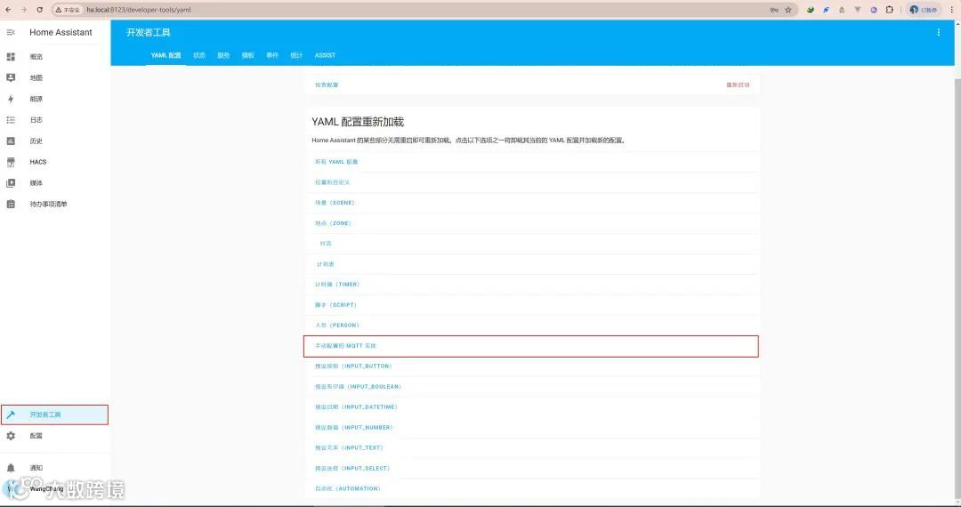 然后按下Shift + :输入wq 并且按下enter键进行保存。同时打开HA的Web界面。从左侧的导航打开开发者工具。重载手动配置的MQTT实体。