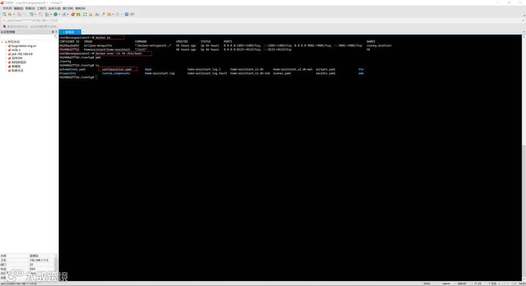 拷贝这个配置,并且打开Shell。使用命令 docker exec -it [你的容器ID] /bin/bash 登录到HA中。