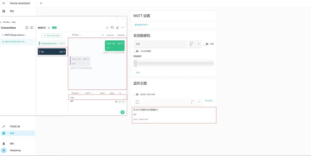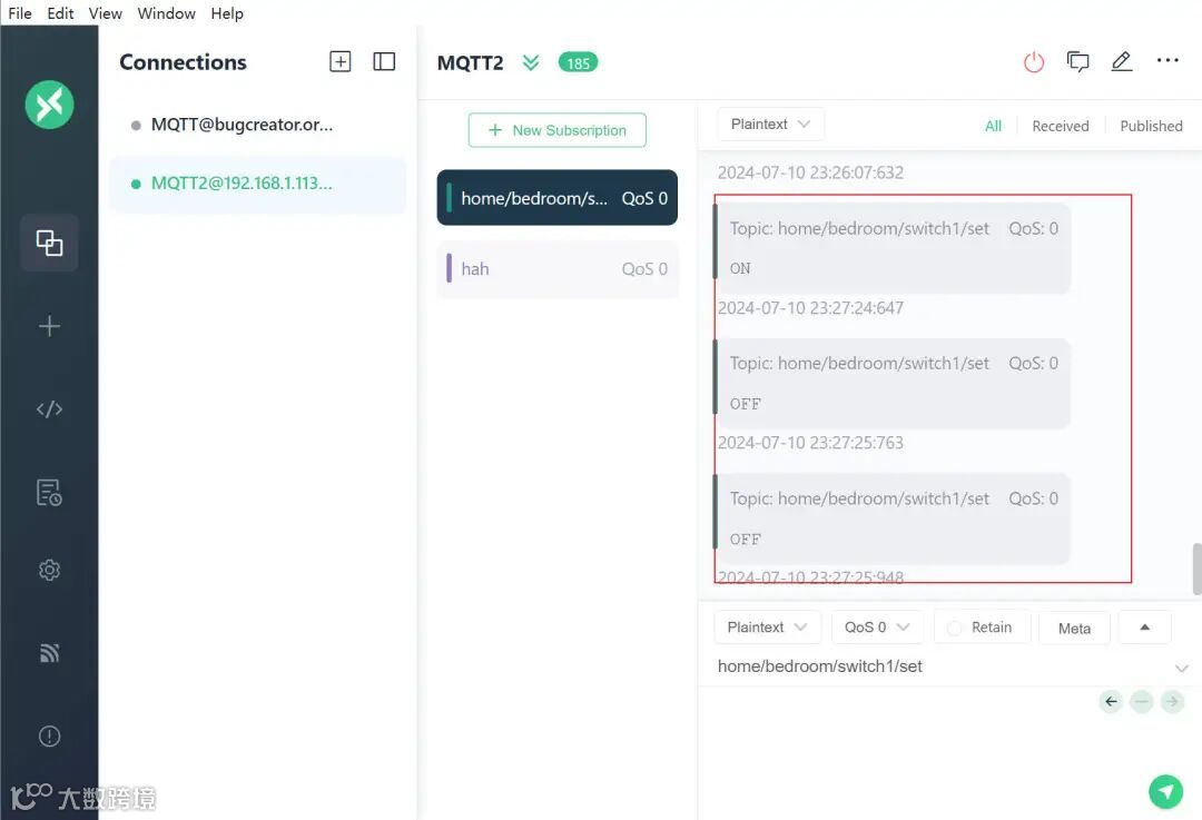 此时如果你点击这个开关的话,你可以在MQTT的客户端的当前队列中看到HA向这个Message queue 的 topic 发送消息