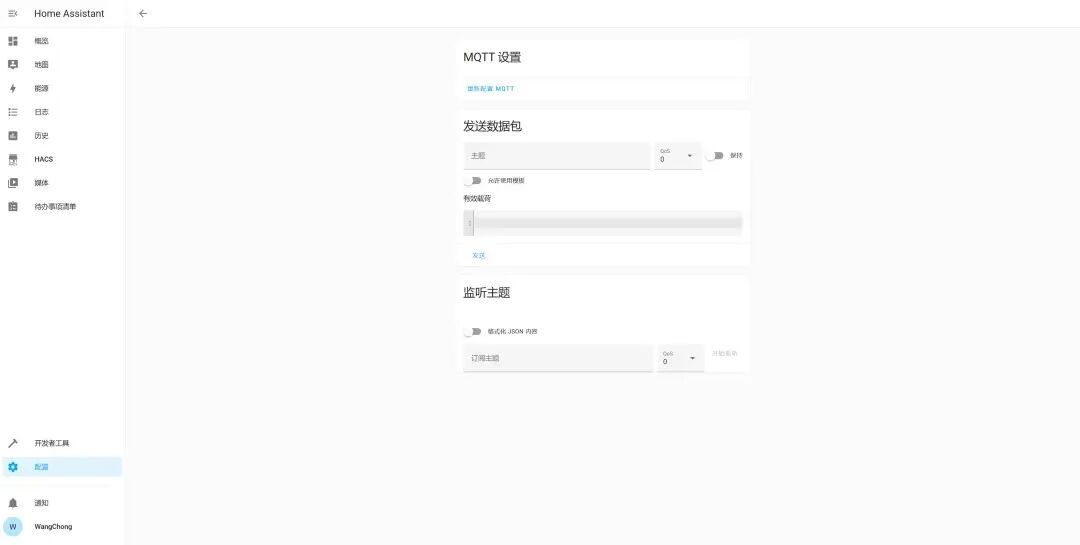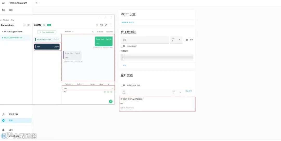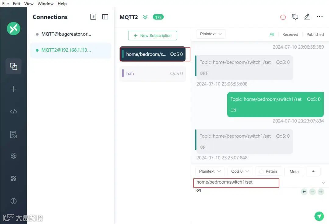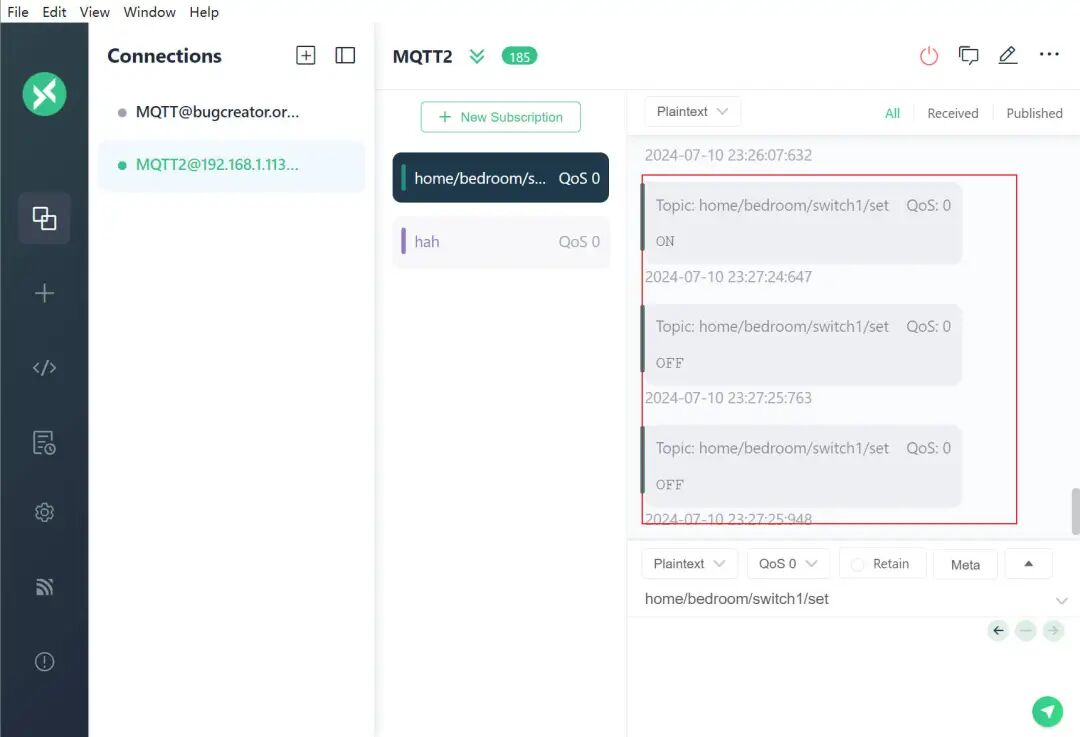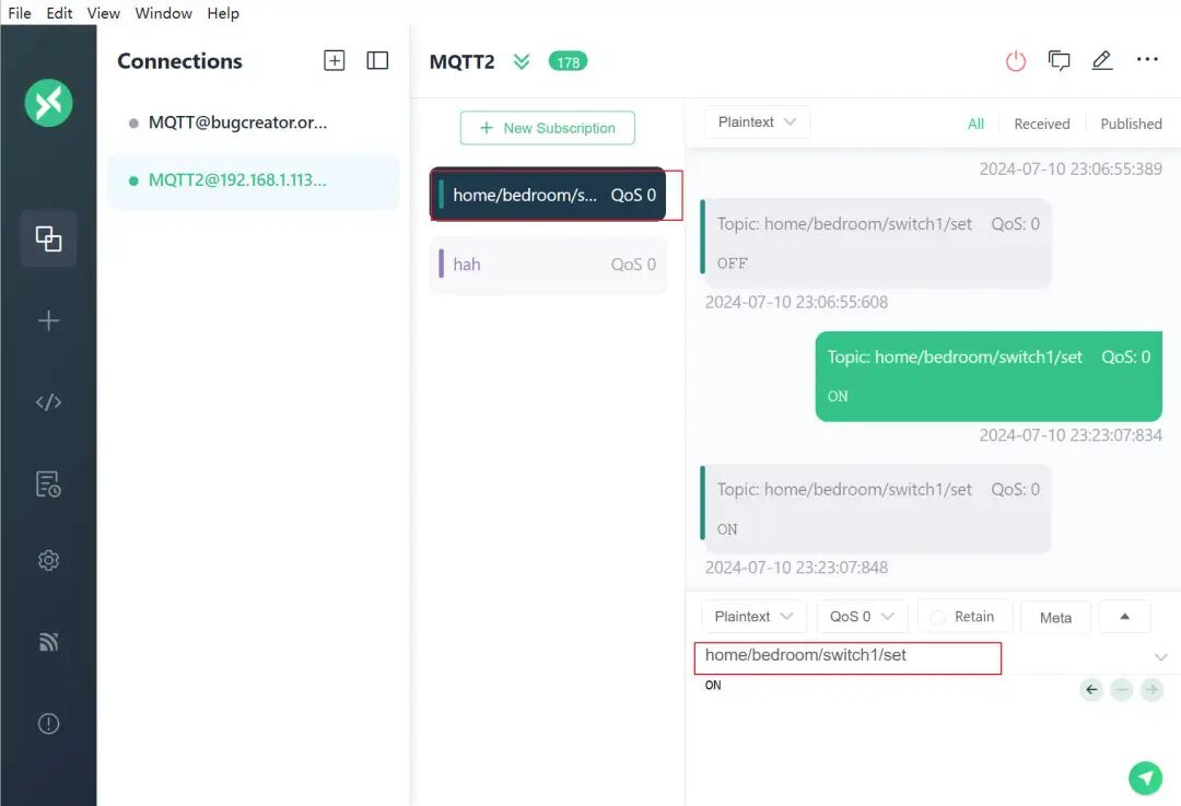 此时HA已经配置完毕。我们只需要向home/bedroom/switch1/set