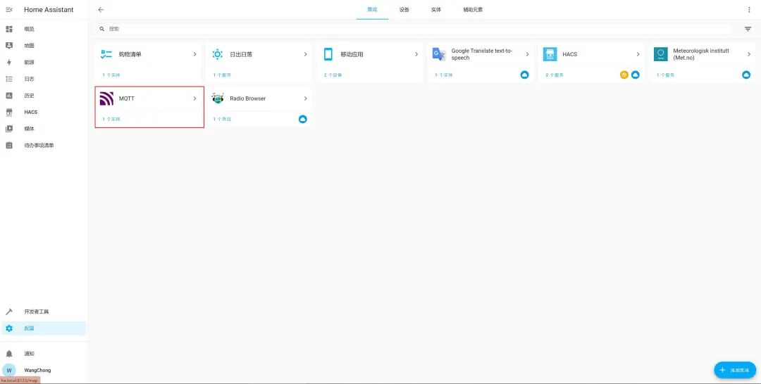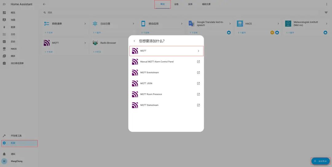 打开已经安装好的HA的Web网站。在左侧导航菜单里依次选择,配置, 设备和服务,添加集成,搜索MQTT。