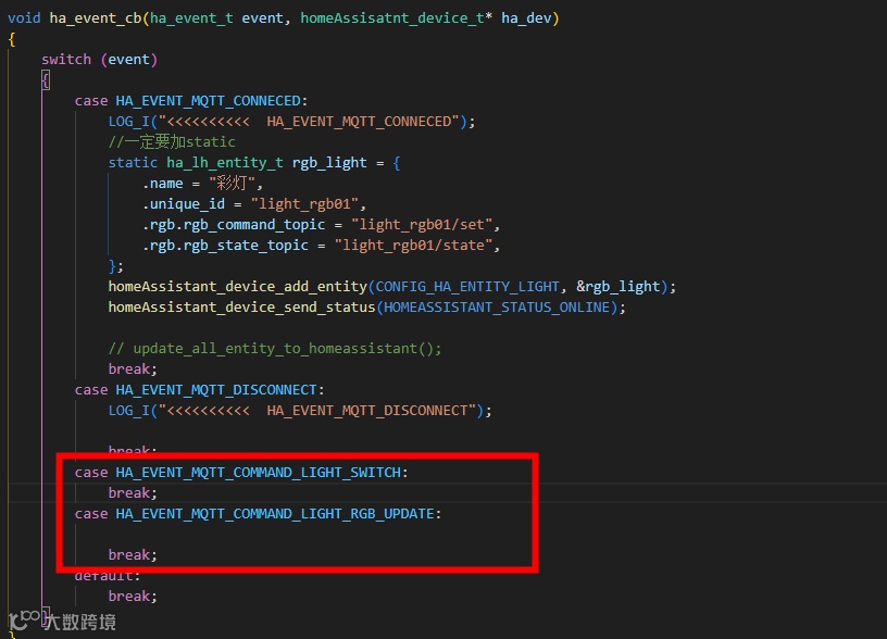 HA_EVENT_MQTT_COMMAND_LIGHT_SWITCH 和 HA_EVENT_MQTT_COMMAND_LIGHT_RGB_UPDATE 这两个事件来控制 RGB,在 HomeAssistant 事件回调函数当中(这里的函数名为:ha_event_cb),添加以下内容:
