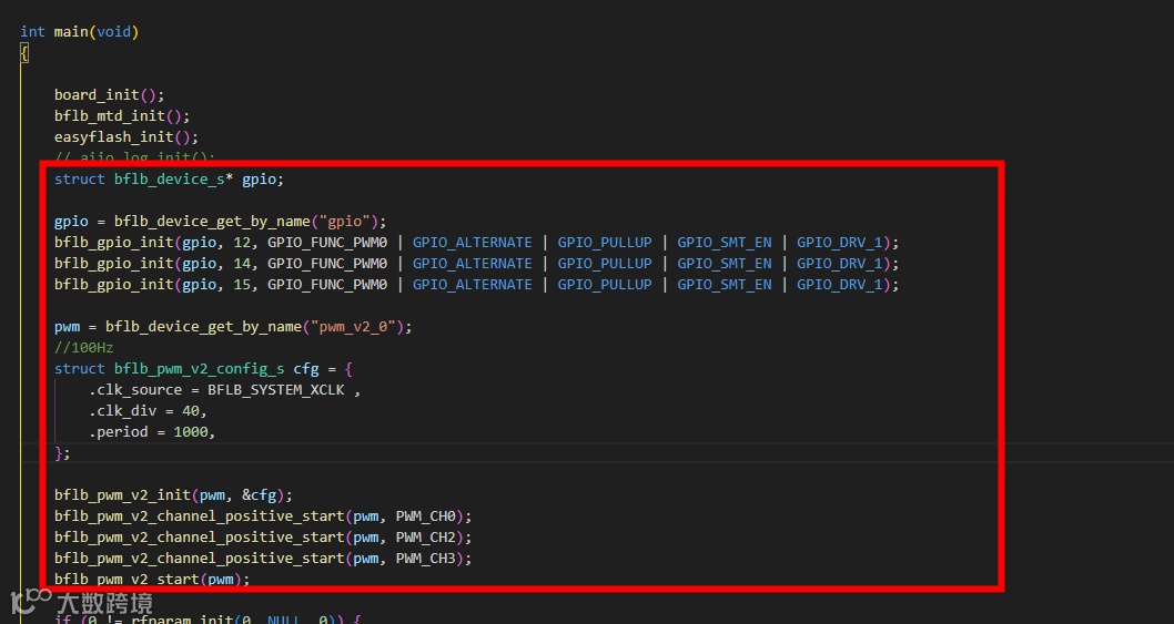 struct bflb_device_s* gpio;gpio = bflb_device_get_by_name("gpio");bflb_gpio_init(gpio, 12, GPIO_FUNC_PWM0 | GPIO_ALTERNATE | GPIO_PULLUP | GPIO_SMT_EN | GPIO_DRV_1);bflb_gpio_init(gpio, 14, GPIO_FUNC_PWM0 | GPIO_ALTERNATE | GPIO_PULLUP | GPIO_SMT_EN | GPIO_DRV_1);bflb_gpio_init(gpio, 15, GPIO_FUNC_PWM0 | GPIO_ALTERNATE | GPIO_PULLUP | GPIO_SMT_EN | GPIO_DRV_1);pwm = bflb_device_get_by_name("pwm_v2_0");//100Hzstruct bflb_pwm_v2_config_s cfg = {.clk_source = BFLB_SYSTEM_XCLK ,.clk_div = 40,.period = 1000,};bflb_pwm_v2_init(pwm, &cfg);bflb_pwm_v2_channel_positive_start(pwm, PWM_CH0);bflb_pwm_v2_channel_positive_start(pwm, PWM_CH2);bflb_pwm_v2_channel_positive_start(pwm, PWM_CH3);bflb_pwm_v2_start(pwm);