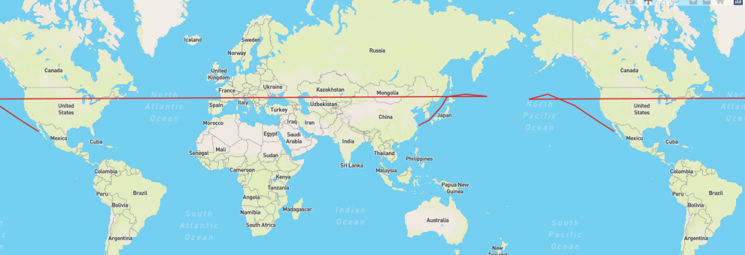 看似我们的轨迹已经完成了,而实际上,bug仍然没有显现。熟悉船舶航线的人会知道,中国有到美国洛杉矶,到南美智利的航线,或者到巴西圣保罗的航线,这些航线有一个特点:就是都需要穿过180度经线,当我们按照上述方法来绘制轨迹的时候,会出现丑到爆炸的轨迹,具体脚本不再赘述,模拟坐标轨迹如下: