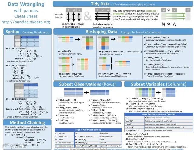 今天这篇文章,就当作是pandas教程的开篇文章吧!这是由Pandas官方发布的两张 “小抄”,内容不像matplotlib小抄那么多,但是内容确实极其精简,肯定可以迅速带你 “理清” Pandas学习思路。