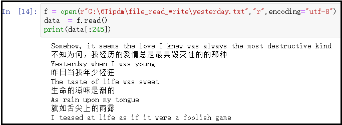 f = open(r"G:\6Tipdm\file_read_write\yesterday.txt","r",encoding="utf-8")