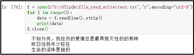 f = open(r"G:\6Tipdm\file_read_write\test.txt","r",encoding="utf-8")