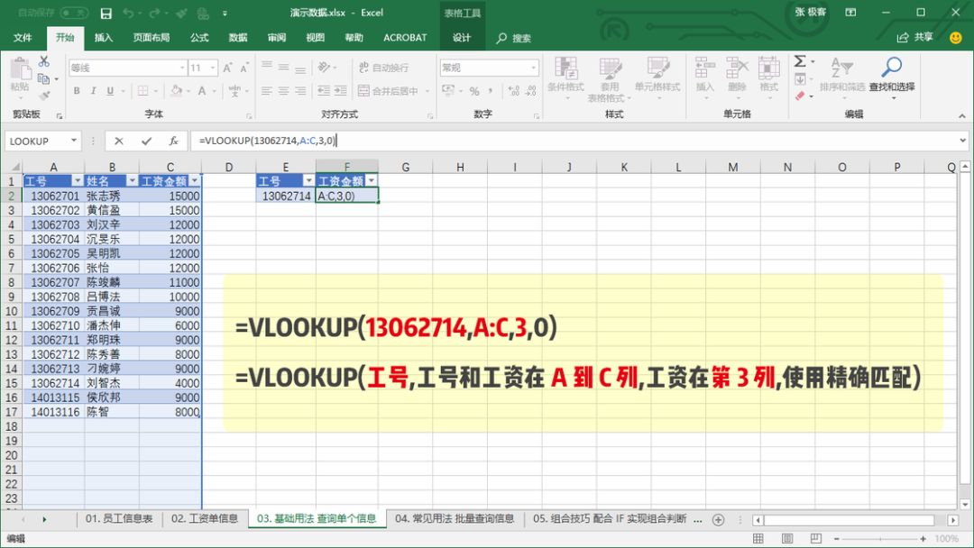 在这个例子中,VLOOKUP 函数的作用就是告诉电脑「我的工号,工号和工资信息,工资在第几列,是否模糊查询」 。比如我想查询工号为 13062714 的工资,工号和工资分别在 A 和 C 列,需要查询的数据在第 3 列。