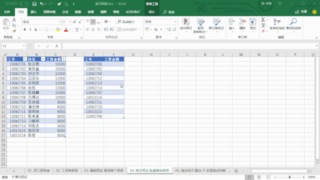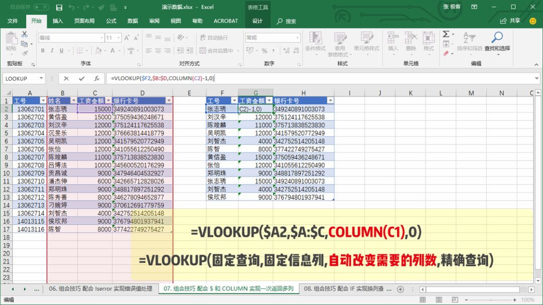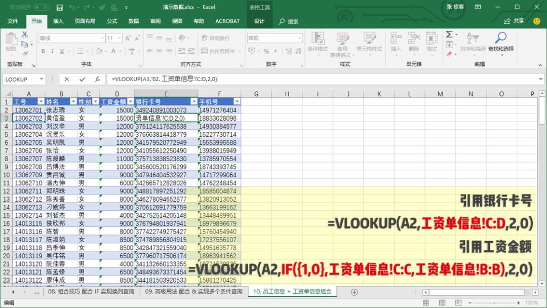 在示例表格中,「工资单信息」的排序方式是姓名、工资金额、工号、银行卡号。工资金额在工号之前,利用「组合技巧:配合 IF 实现换列查询」中的内容,将两列信息进行调换,即可实现工资金额的自动填充。