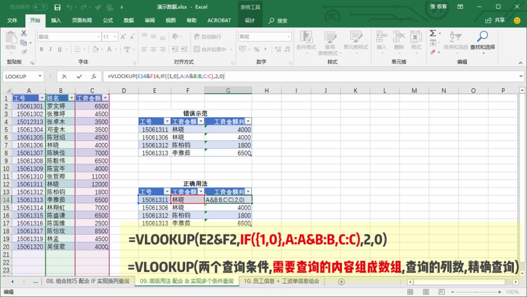 有时候满足条件的值有许多种,比如演示数据中有两个叫「林晓」的员工,此时我们可以通过工号+姓名的方式来实现准确的匹配。