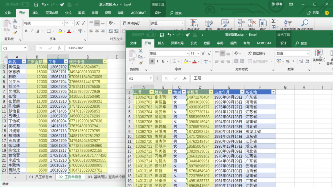 假设公司原先有一张记录了「工号、姓名、性别、手机号、身份证号」的员工信息表。最近需要为员工发工资了,公司又统计了一张含有「姓名、工资金额、工号、银行卡号」的工资表。我们需要做的是在「员工信息表」中加上银行卡号和工资金额信息,去掉不需要的敏感信息。
