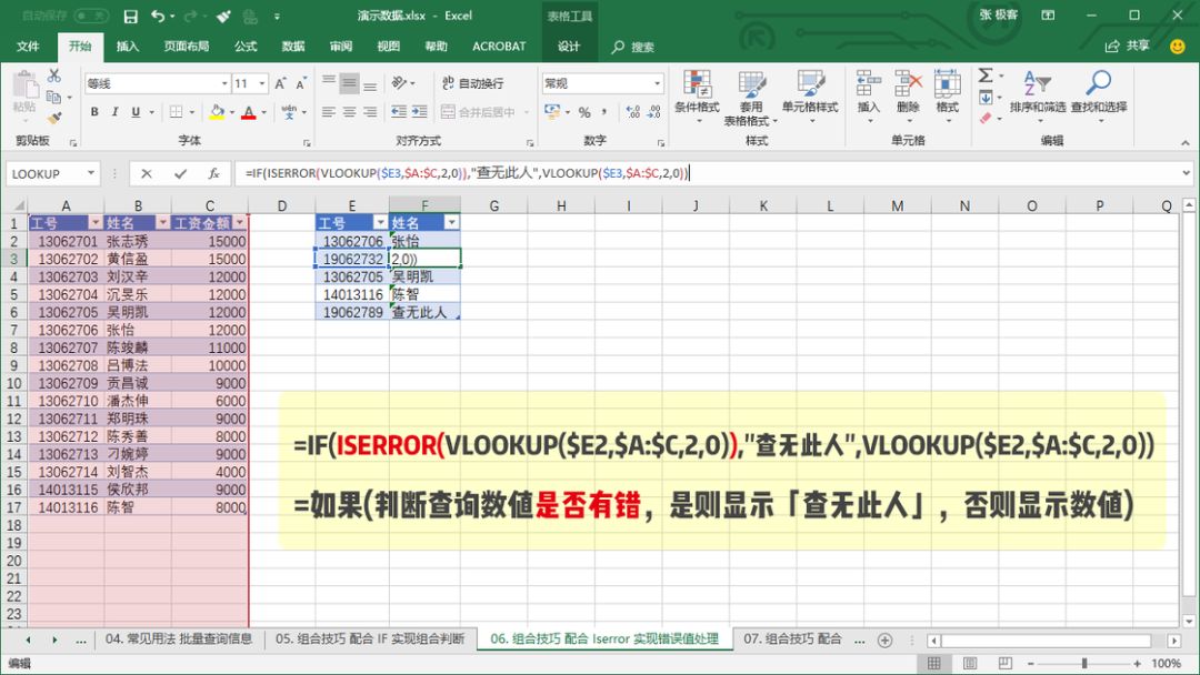 =IF(ISERROR(VLOOKUP($E2,$A:$C,2,0)),"查无此人",VLOOKUP($E2,$A:$C,2,0))