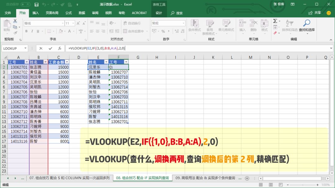 这个问题在于,VLOOKUP 默认在第一列的数据中查询,在工号这列找姓名当然是找不到的。所以我们就要想办法把这两列调换一个位置,让 VLOOKUP 函数得以正常运行。但是公司内部的表格结构通常是统一的,不能随意调换位置。这里就要配合 IF 函数来实现换列查询。