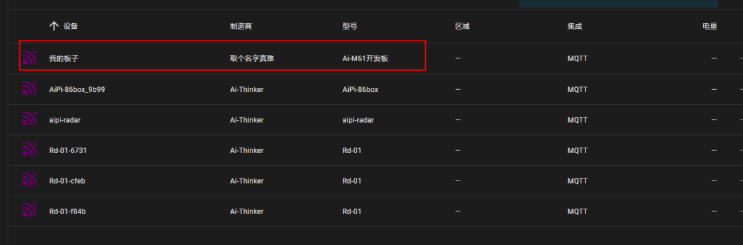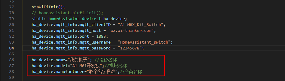 ha_device.name="我的板子"; //设备名称ha_device.model="Ai-M61开发板";//模块名称ha_device.manufacturer="取个名字真难";//产商名称